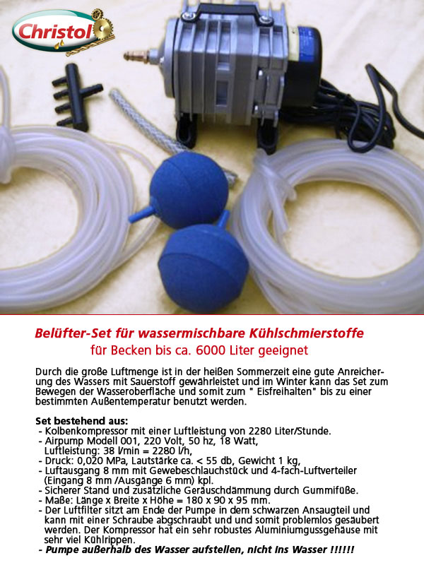 bestehend aus Kompressor, Luftschlauch, Zeitschaltuhr und Rückschlagventil